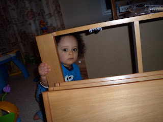 This evening before this picture was taken, he had his first bloody lip. :o( He was getting a little daring going from his Lion walker to his giraffe thingie... and the Lion took off on him. :( I know... the first of many accidents to come... but it still makes me sad...